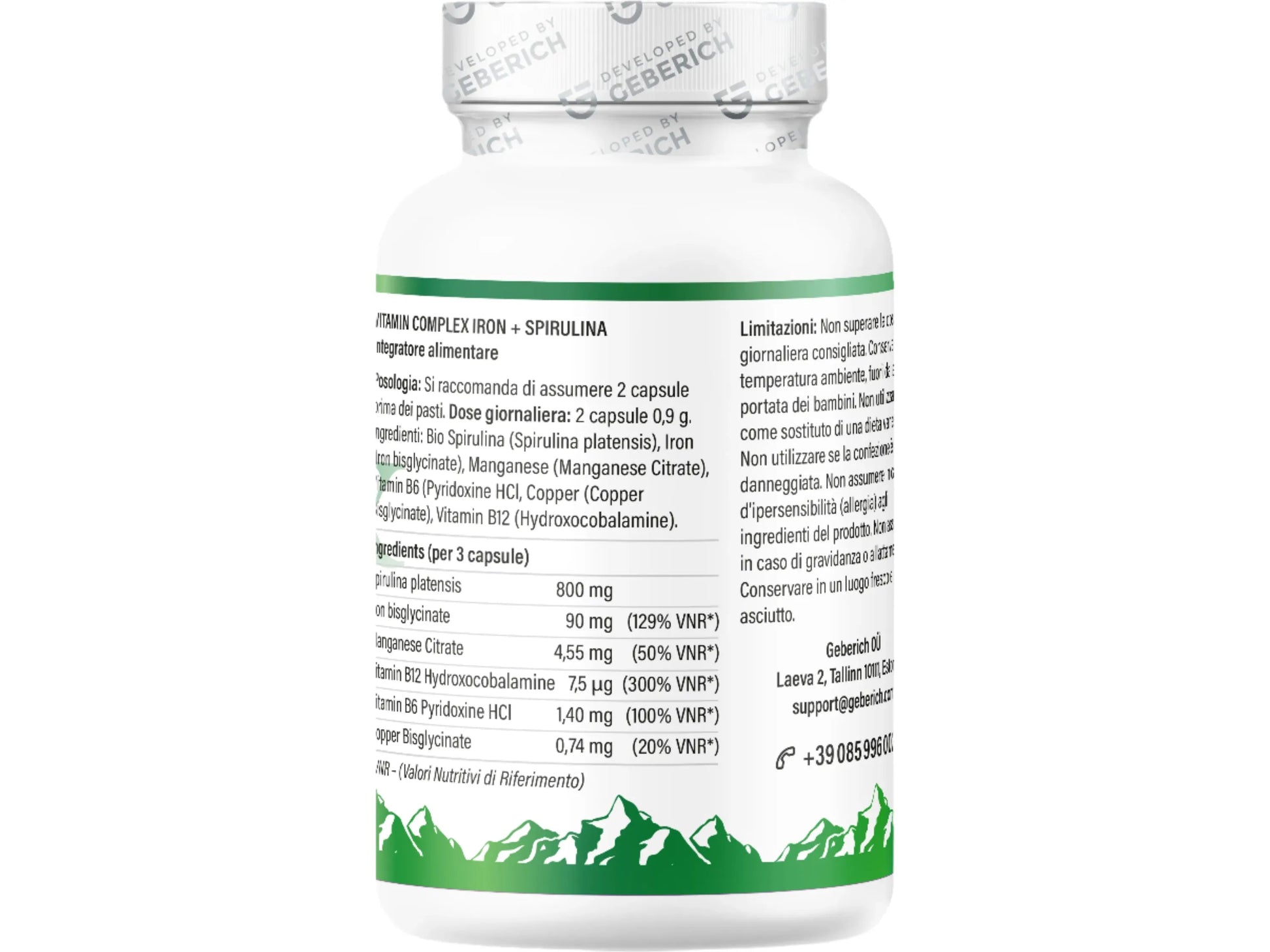 Iron Spirulina is a food supplement featuring spirulina powder, iron bisglycinate, and vitamins. It is designed for those looking to support normal energy metabolism, immune function, and overall vitality.